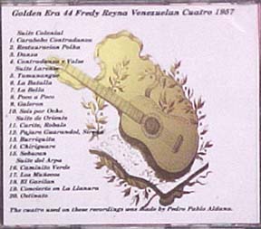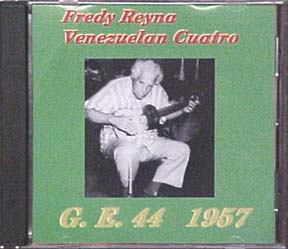 G.E. 44 ベネズエラのCuatro Fredy Reyna 1957 CD $17.00 "Fredy Reynaは彼のcuatro の楽器の能力と演奏者の技量をもってAndres Segoviaを驚かす。Segoviaの驚きは“ギターの上で”,,,可能ではあるが、まるで小さな他の惑星から来たような。しかしながら、どの弦も失っているわけではない。