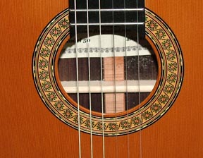This top of the line Luis Molina classical guitar is constructed by a single luthier and has a 10 fan brace system, with a treble restricter and 2 bottom chevrons. The front binding is very fancy to the eye. The resonance is very thick in the bass and it has an enormous projection in the treble, allowing for a great crescendo abilty. I would describe the tone as "muy caliente" or in English "very hot", whether you play arpeggios, scales or lyrical movements. This is a great complement to the rest of the FFSI inventory.