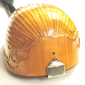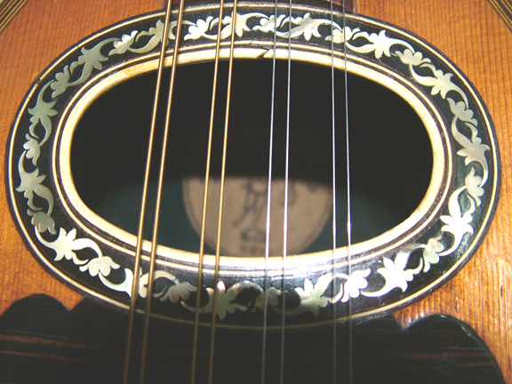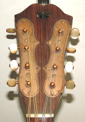 This very ornate mandolin was made in Germany many decades ago. It has, as the photos show, Inlaid gears with pearl buttons, over the Indian Rosewood peghead overlay, Mother-of-Pearl rosette, a beautiful fluted back of Maple, a radial (rounded) rosewood fingerboard, original Ebony bridge with nickel silver saddle. It does not have the original case, but a comtemporary soft shell case. The neck is dead straight and the resonance and ability to produce crescendos is phenomenal.